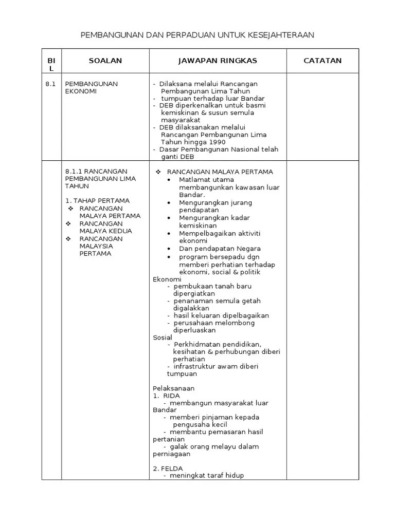 Akram terengganu 10 months ago. Documents similar to bab 8 pembangunan dan perpaduan untuk kesejahteraan. 1.pembangunan ekonomi pembangunan dan perpaduan untuk kesejahteraan 2.pembangunan dan perpaduan bangsa 3 1.1 :rancangan pembangunan lima tahun plt merupakan satu gagasan ekonomi yang diperkenalkan untuk menaiktaraf kehidupan. Soalan kertas 3 bab 8: Berikut dikongsikan tema umum, tugasan spesifik dan skema jawapan untuk sekarah kertas 3 spm bab 8 bertajuk pembangunan dan perpaduan untuk kesejahteraan.