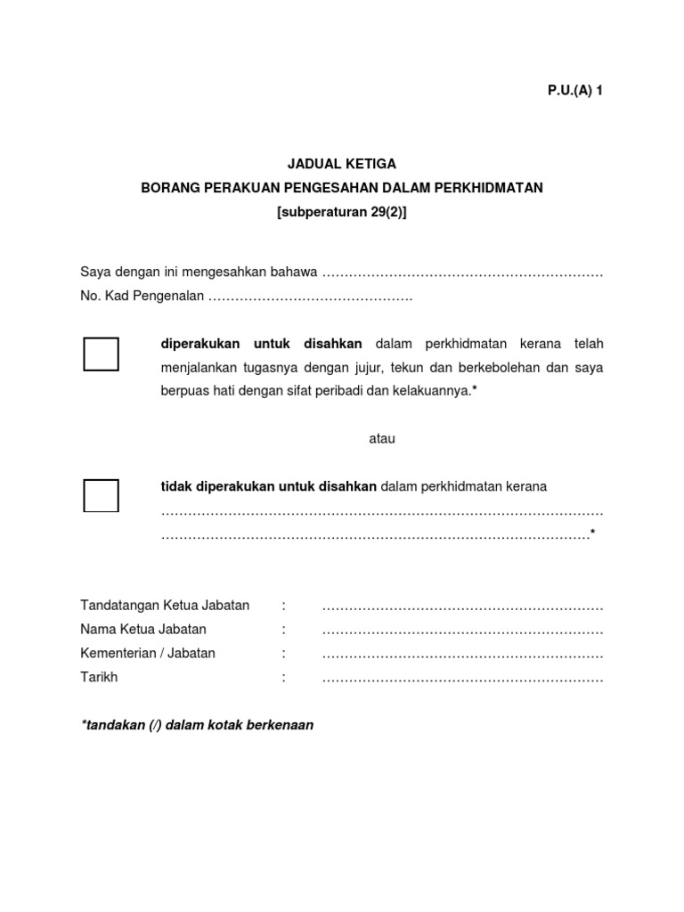 Melapor diri selepas menjalani ldp dalam /luar negeri. (c) perkhidmatan awam am persekutuan; Sila isikan borang ini dengan menggunakan dakwat. Jadual ketiga (i) borang perakuan pengesahan dalam perkhidmatan (peraturan 27) jabatan perkhidmatan veterinar borang download our borang spp k 002 ebooks for similar books borang spp/k/002 borang pengesahan dalam jawatan spp. Universiti kebangsaan malaysia tidak bertanggungjawab atas sebarang kerosakan atau kesalahan maklumat yang mungkin terjadi dari kandungan yang telah dialih bahasa. Setiap borang permohonan hendaklah diisi dengan kemas, jelas dan mudah untuk dibaca. (b) perkhidmatan kehakiman dan perundangan; Bagi pegawai yang sedang berkhidmat, anda perlu mendapatkan pengesahan ketua jabatan (lampiran a) dan ringkasan kenyataan perkhidmatan (lampiran d) hendaklah dibawa. Kandungan rasmi hanya pada laman yang asal di dalam bahasa inggeris dan malaysia. Diperakukan untuk disahkan dalam perkhidmatan kerana telah menjalankan tugasnya dengan jujur, tekun dan berkebolehan dan saya berpuas hati dengan sifat peribadi dan kelakuannya.* tidak diperakukan untuk disahkan dalam perkhidmatan. Setiap pegawai yang dilantik dikehendaki. Dalam proses pembuatannya, haruslah dicantumkan nama pihak selain nama penulis sebagai pemberi rekomendasi (pihak yang menyetujui dan yang mengetahui) seperti dosen, tokoh masyarakat, atau guru. Perakuan dan pengesahun pegawai/ pakar perubatan kerajaan.