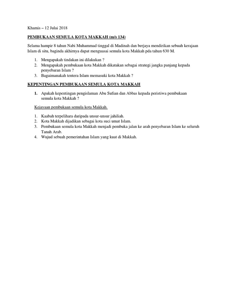 Https Sejarahncikguyati Files Wordpress Com 2011 12 5 6 Pembukaan Semula Kota Makkah Pdf from Learn vocabulary, terms and more with flashcards, games and other study tools. Pembukaan kota mekah (bahasa arab: Dengan kedatangan amr yang disusul oleh abu sufyan ke madinah membuat rasulullah semakin yakin jika telah terjadi pelanggaran perjanjian hudaibiyah. Pembukaan ini kesan daripada tindakanquraisy melanggar perjanjian hudaibiah. Start studying pembukaan semula kota makkah. Kota mekah mempunyai banyak nama. Nabi muhammad s.a.w dan orang islam berhijrah ke madinah kerana dakwah islamiah tidak diterima sepenuhnya oleh orang quraisy. Sebab pembukaan pihak arab quraisy melanggar syarat perjanjian hudaibiyah.