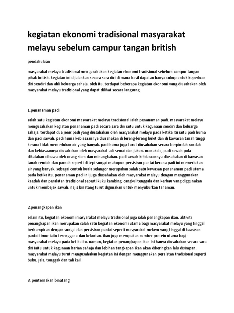 Selain sistem sara diri, ekonomi komersial juga. Di tahun tersebut, raja kerajaan. Masyarakat kerajaan alam melayu juga menjalankan pelbagai kegiatan ekonomi seperti pertanian, perdagangan, mengutip hasil hutan dan hasil laut serta perlombongan dan pembuatan. Kegiatan ekonomi yang dilakukan rumah tangga perusahaan meliputi kegiatan konsumsi, produksi, dan distribusi. Erat dengan corak dan tradisi maritim kerajaan melaka dan beberapa buah kerajaan melayu selepas itu.