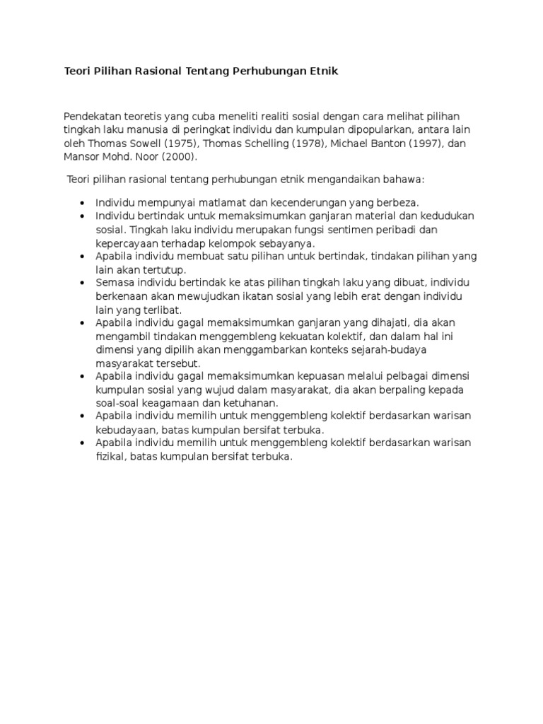 Related : Teori Pilihan Rasional Tentang Hubungan Etnik : Teori pilihan rasional banton (1997), mansor (2000):.